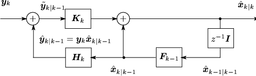 1段予測型Kalmanフィルタのブロック線図。