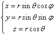 原点 O からの距離 r 、x 軸の正の方向から測った角度 φ 、z 軸の正の方向から測った角度 θ を使って表します。